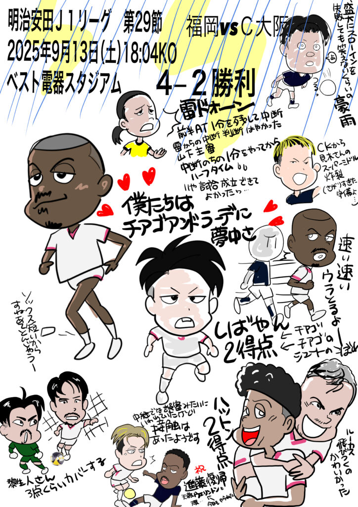明治安田J1リーグ 第29節2025年9月13日(土)18:04KO 福岡vsC大阪 ベスト電器スタジアム 4−2勝利