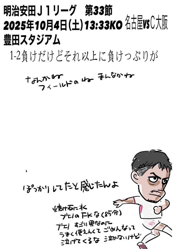 明治安田J1リーグ 第33節2025年10月4日(土)13:33KO 名古屋vsC大阪 豊田スタジアム 1-2負けだけどそれ以上に負けっぷりが